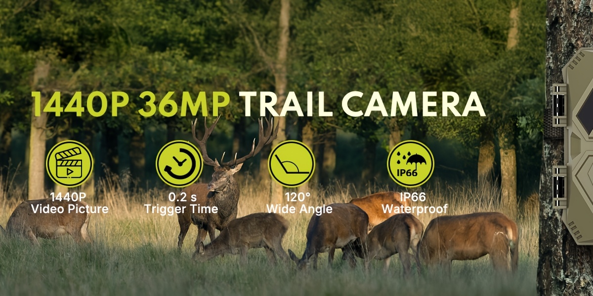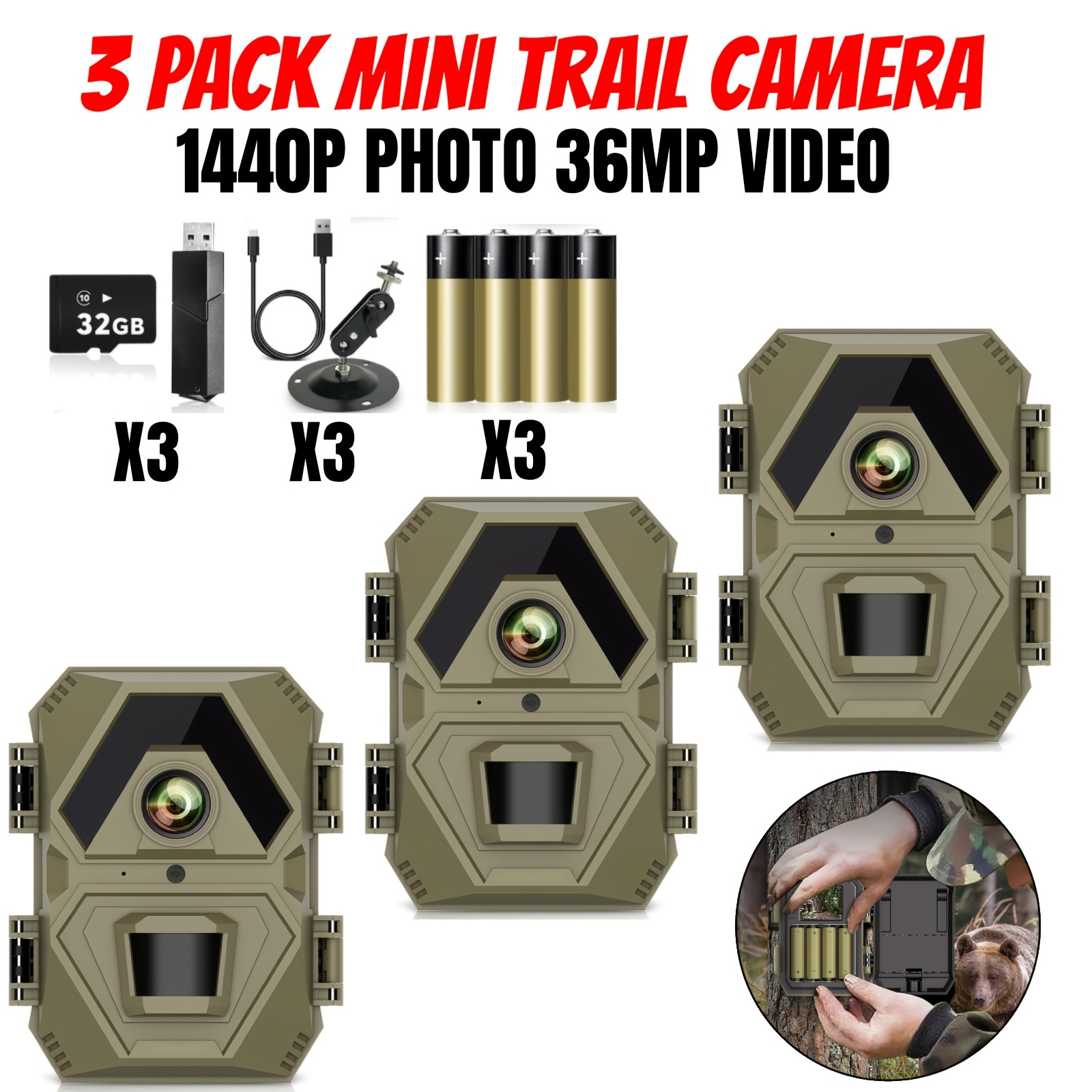 3 Pack Mini Trail Camera | 1440P Video 36MP Photo, Game Camera with Night Vision, 0.2s Trigger Time Motion Activated, IP65 Waterproof, 120° Wide-Angle, for Wildlife Monitoring, Includes Card Reader and 32GB SD Card