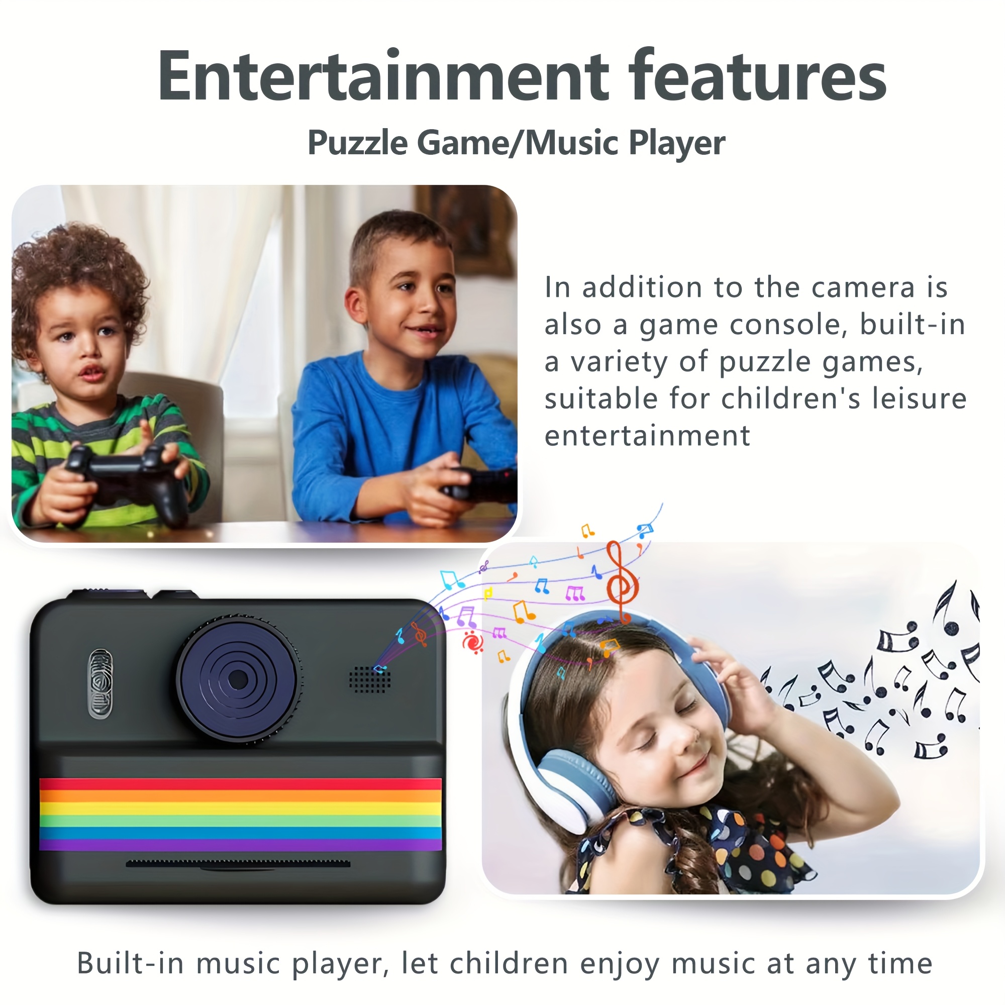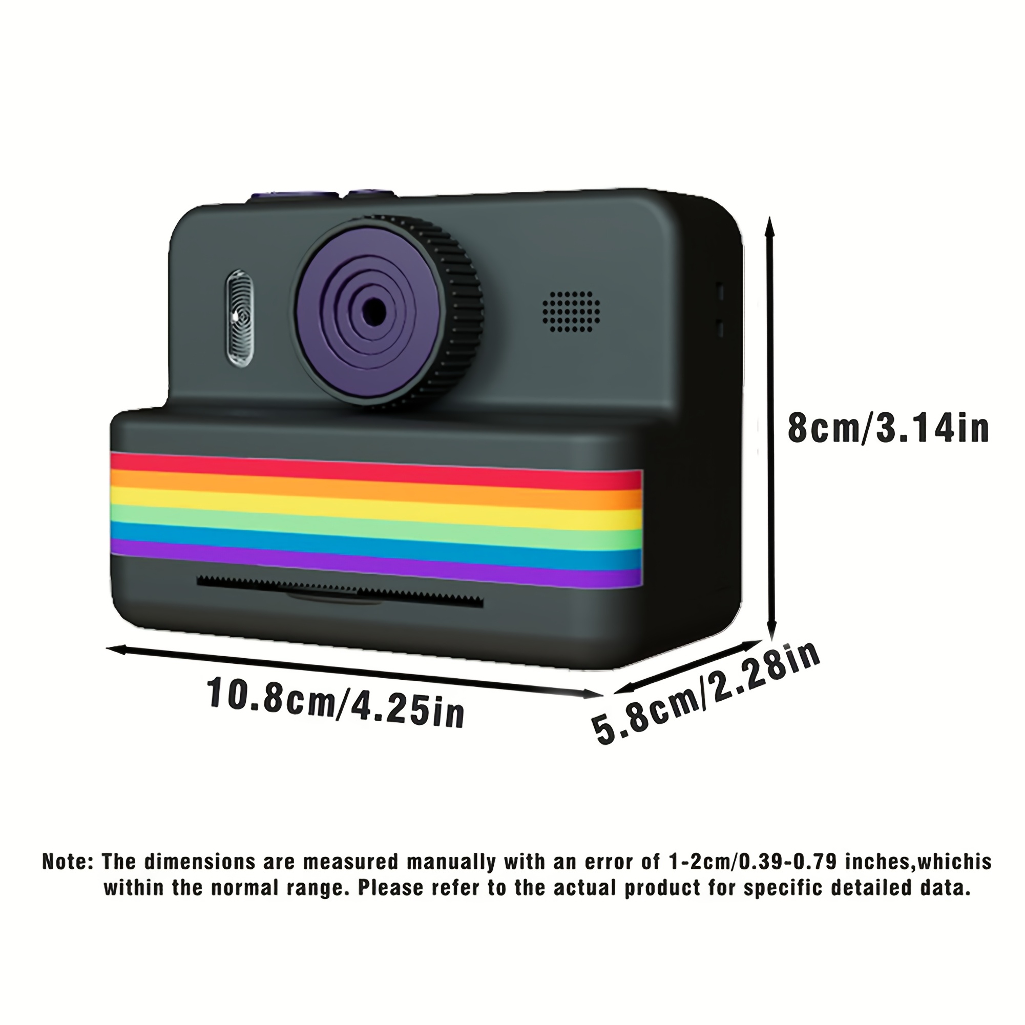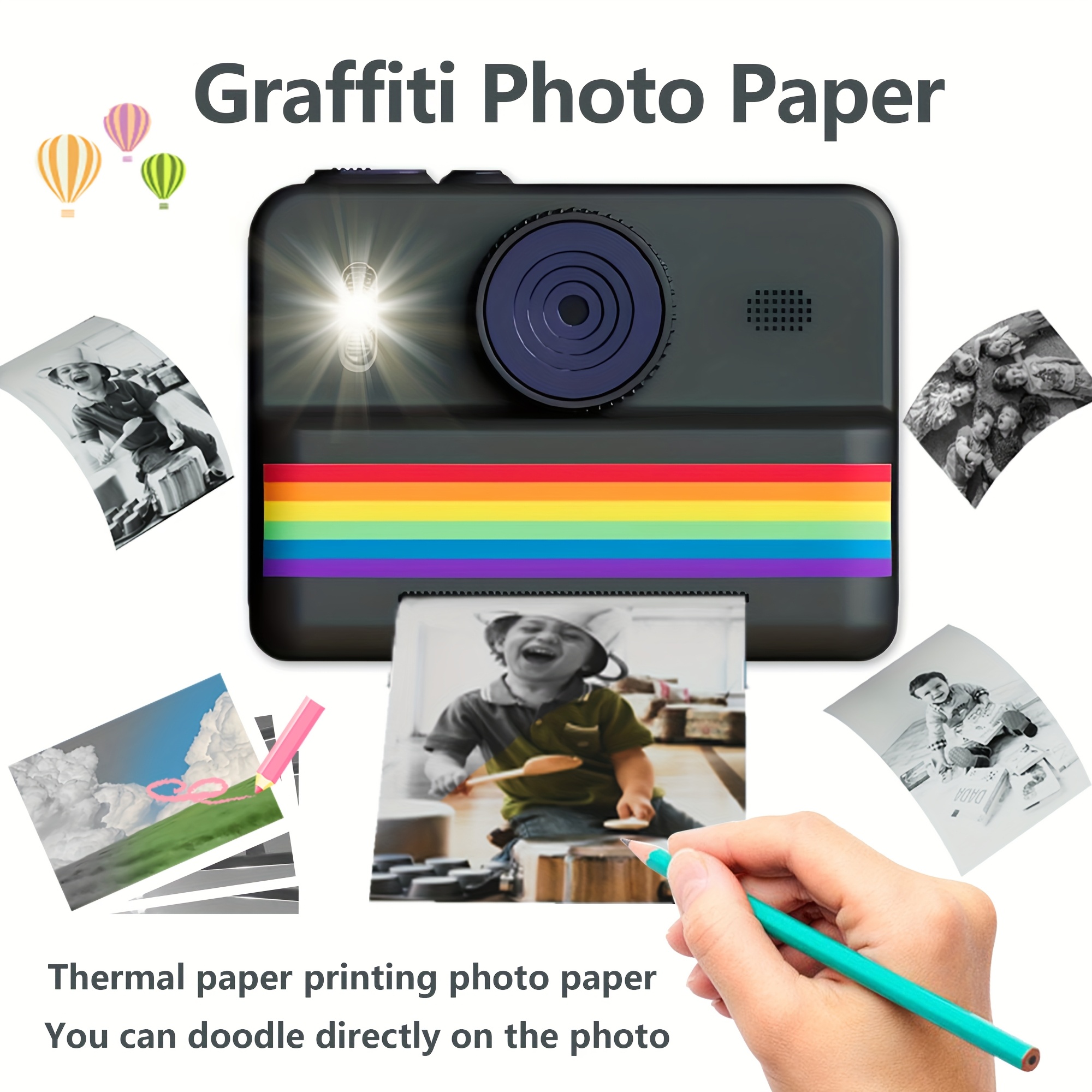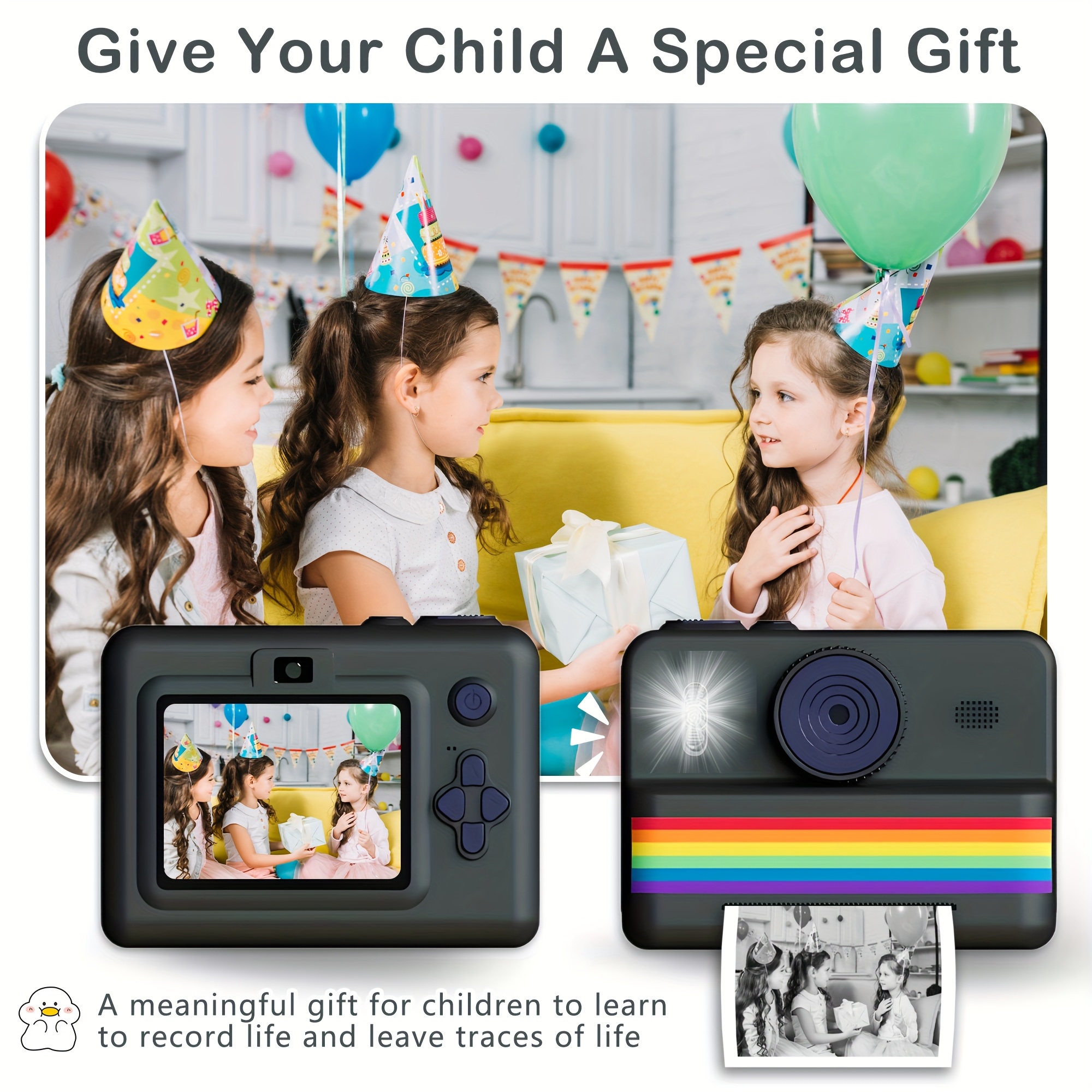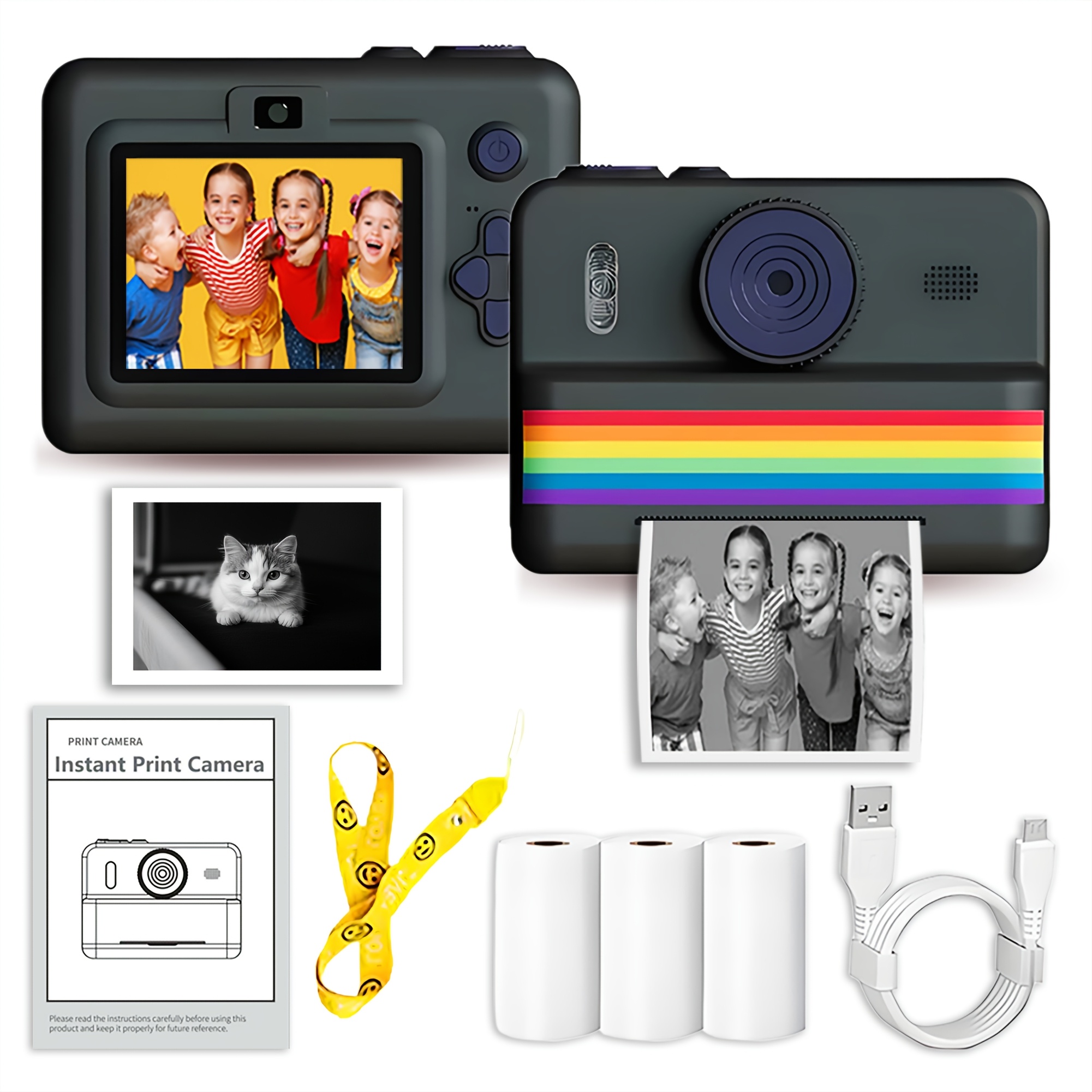 A Camera with Printing Capabilities, Featuring Instant Photo Printing, Comes with Three Rolls of Photo Paper, a Strap, a USB Charging Cable, And a Portable Multifunctional Photo Printer. It Includes a Rechargeable 18650 Lithium Polymer Battery