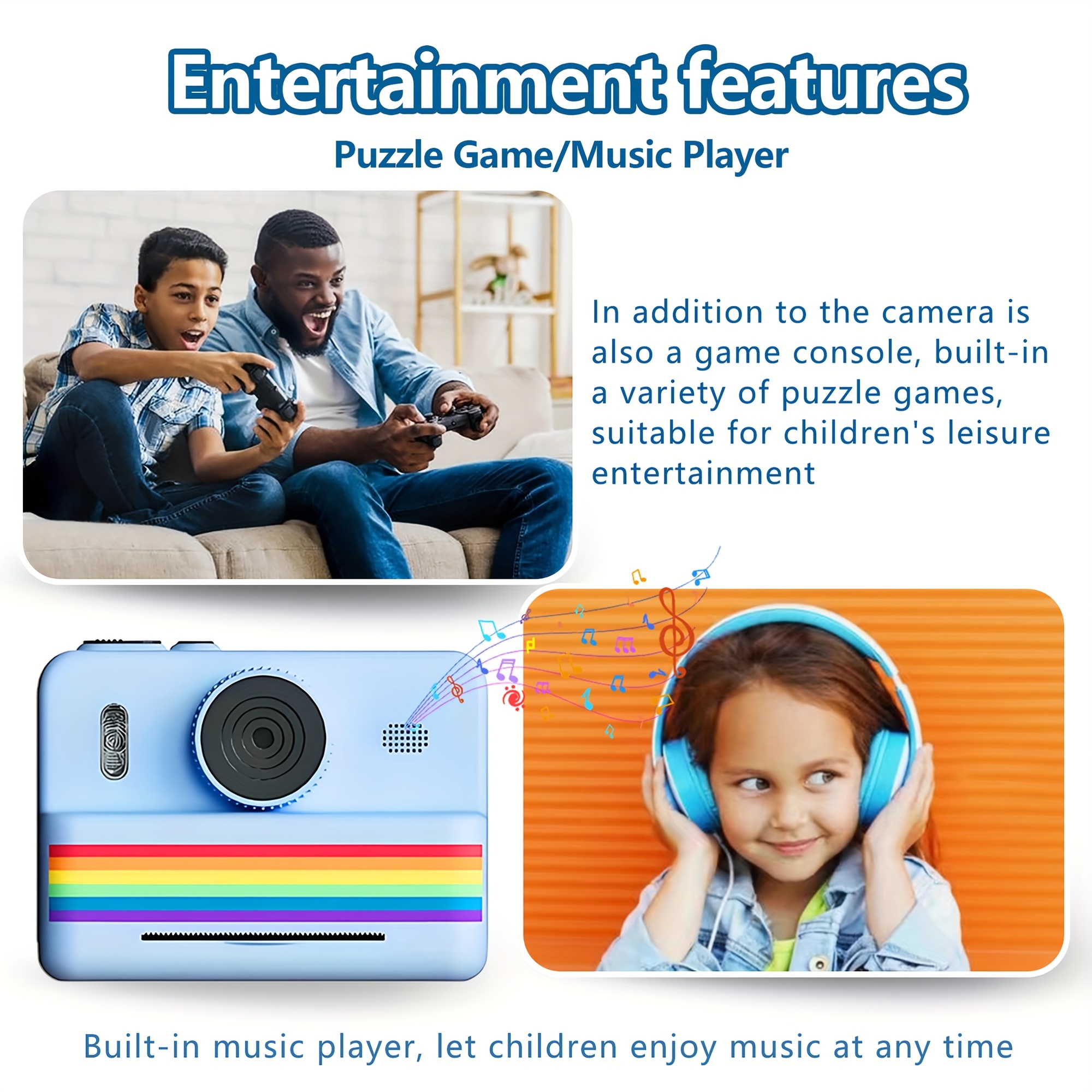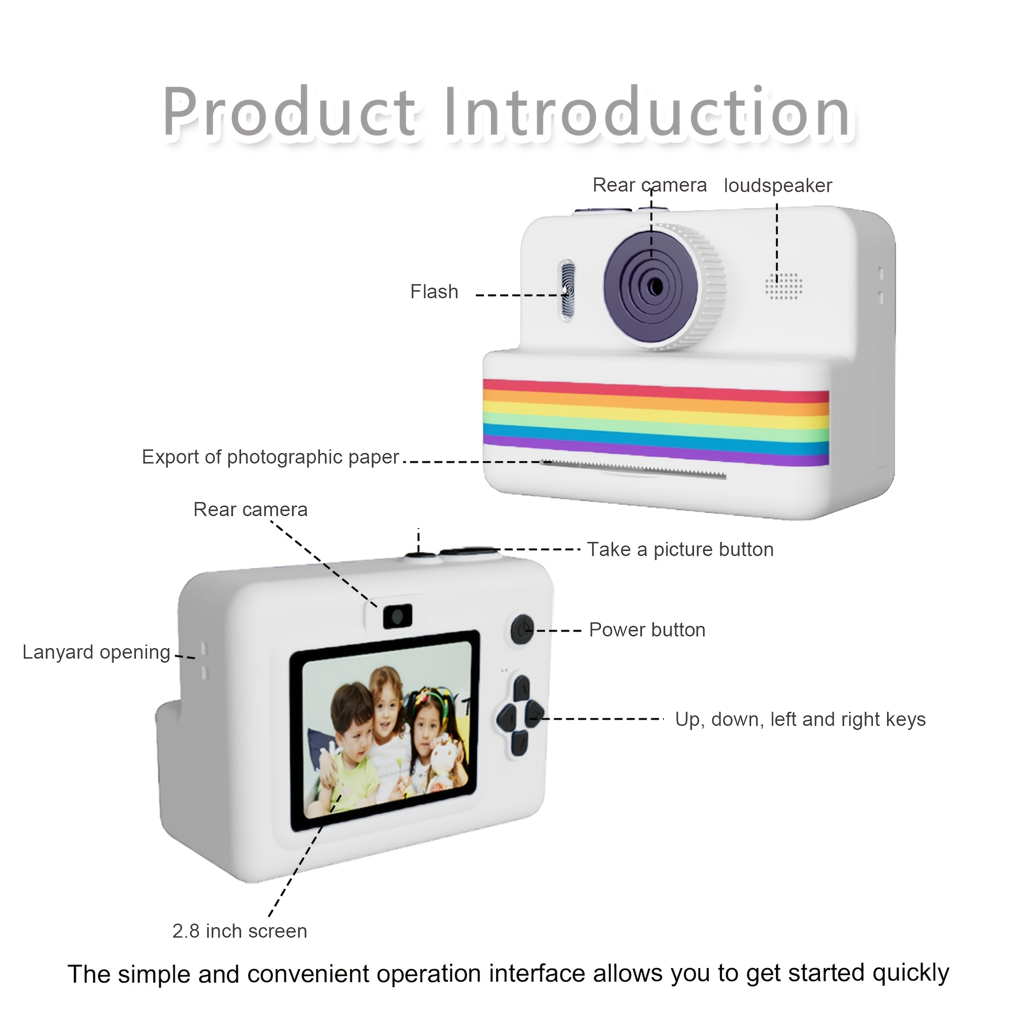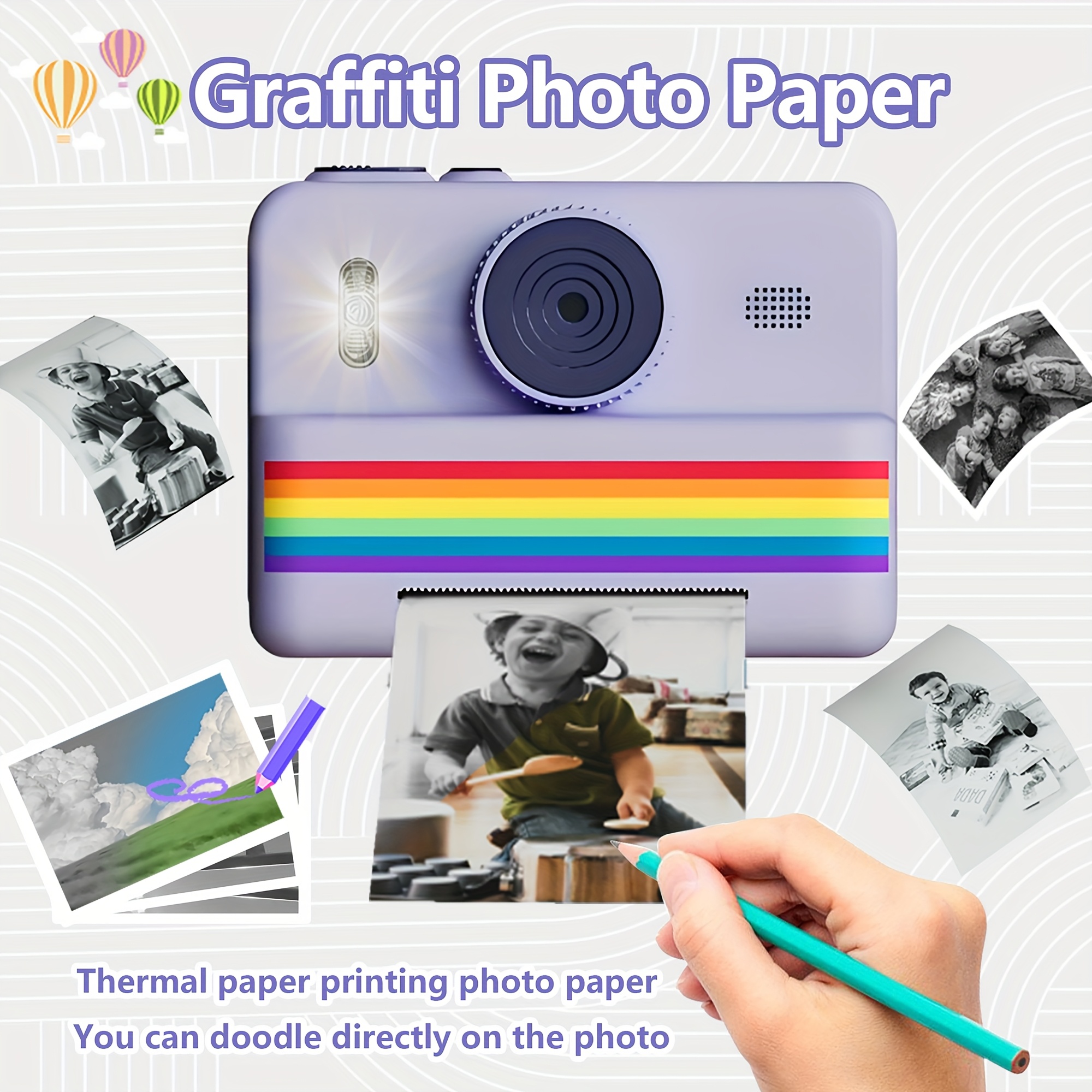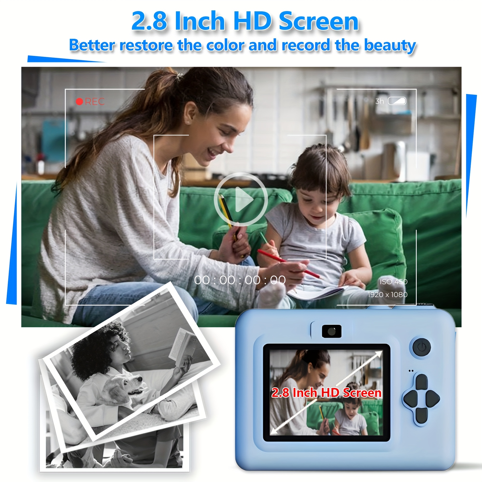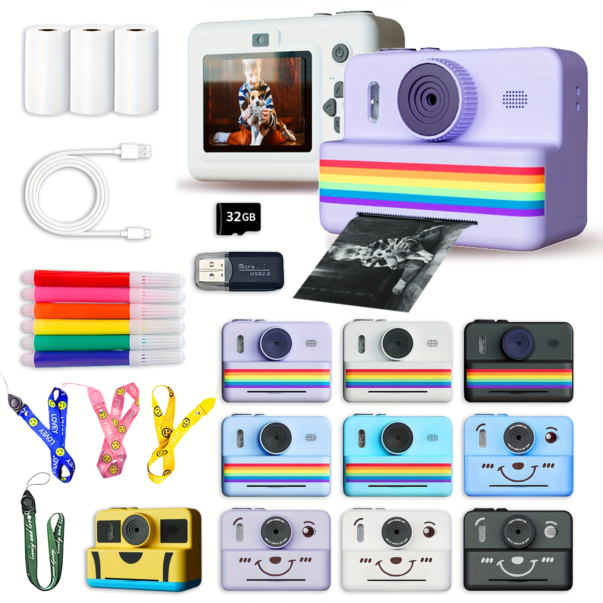 Children's Instant Camera, Kids' Print-on-the-Spot Camera with Printing Function, 2.8-inch HD Screen, 1080P Video, Includes 3 Rolls of Photo Paper, 32GB Memory Card, Card Reader, 6 Paint Brushes, Lanyard, USB Charging Cable, Portable Multifunctional