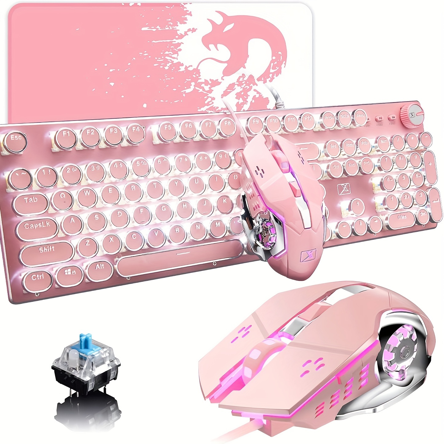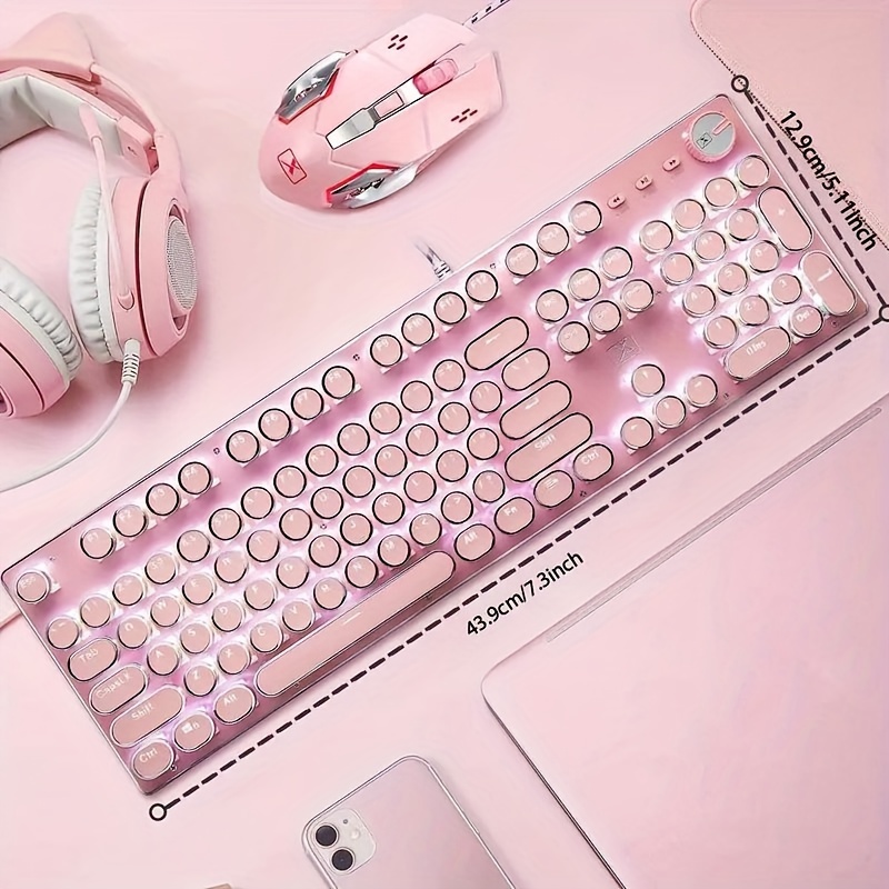 Gaming Keyboard And Mouse, Retro Steampunk Vintage Typewriter-Style Mechanical Keyboard with White LED Backlit, 104-Key Anti-Ghosting Blue Switch Wired USB Metal Panel Round Keycaps